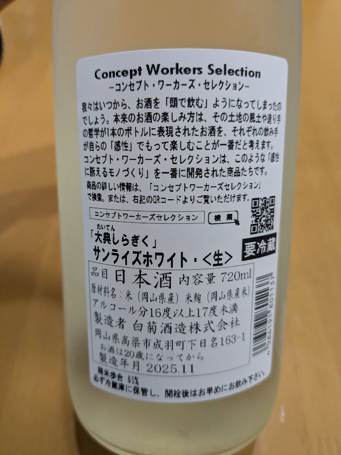 余白の効いたミニマル・ラベルにSUNRISEの文字。岡山・高梁の白菊酒造が手掛ける、**サンライズホワイト〈生〉**です。岡山県産米100%、60%精米。生酒ならではのフレッシュさと、白ぶどうを思わせるクリーンな果実感が心地よい一本。