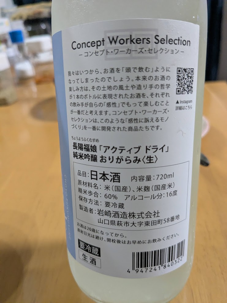 - 銘柄:長陽福娘「アクティブ ドライ」純米吟醸 おりがらみ(生)